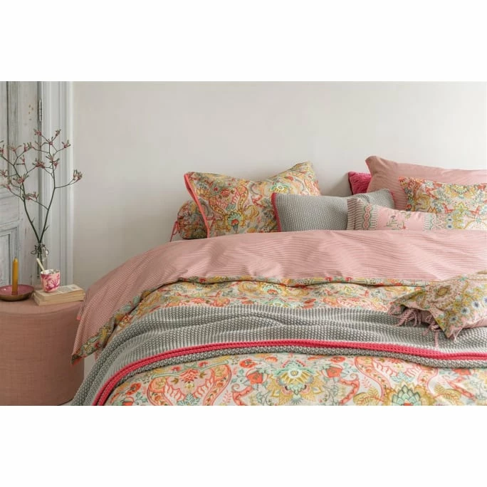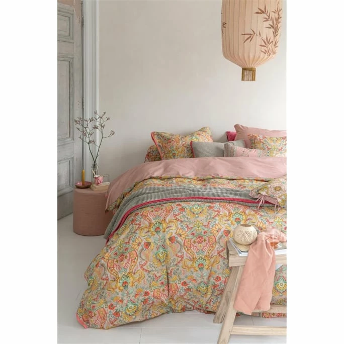 Hochwertig in der Qualität und wunderschön im Design präsentiert sich die Bettwäsche Kyoto Festival von Pip Studio. Die Vorderseite präsentiert sich in einem stilisierten Allover-Print. Dieses sich wiederholende Blumenmuster besteht aus einer Variation fantasievoller Chintzblumen und Blättern. Symmetrisch platzierte Blumenzweige mit aufwendig verzierten Blüten verleihen dieser Bettwäsche eine edle Ausstrahlung. Dieser reich verzierte Bettbezug hat auf der Rückseite einen tonalen Streifen. Dieses detaillierte Zierkissen ist ein Blickfang auf Ihrem Bett. Der Bettbezug und die Kissenbezüge haben an den Seiten eine gesteppte Oxford-Bordüre und die Kissenbezüge haben zwei verschiedene Seiten und einen Schleifenverschluss. Da Sie beide Seiten verwenden können, entsteht ein schöner Mix & Match-Effekt auf Ihrem Bett. Der Bettbezug Kyoto Festival von Pip Studio ist nicht nur ein Blickfang in Ihrem Schlafzimmer, sondern durch die 100% Perkal-Baumwolle auch sehr weich. Perkal ist eine fein gewebte, hochwertige Baumwolle mit einer Fadendichte von 200TC. Kuscheln Sie sich ein und genießen Sie Ihre Träume dank der Bettwäsche Kyoto Festival von Pip Studio.